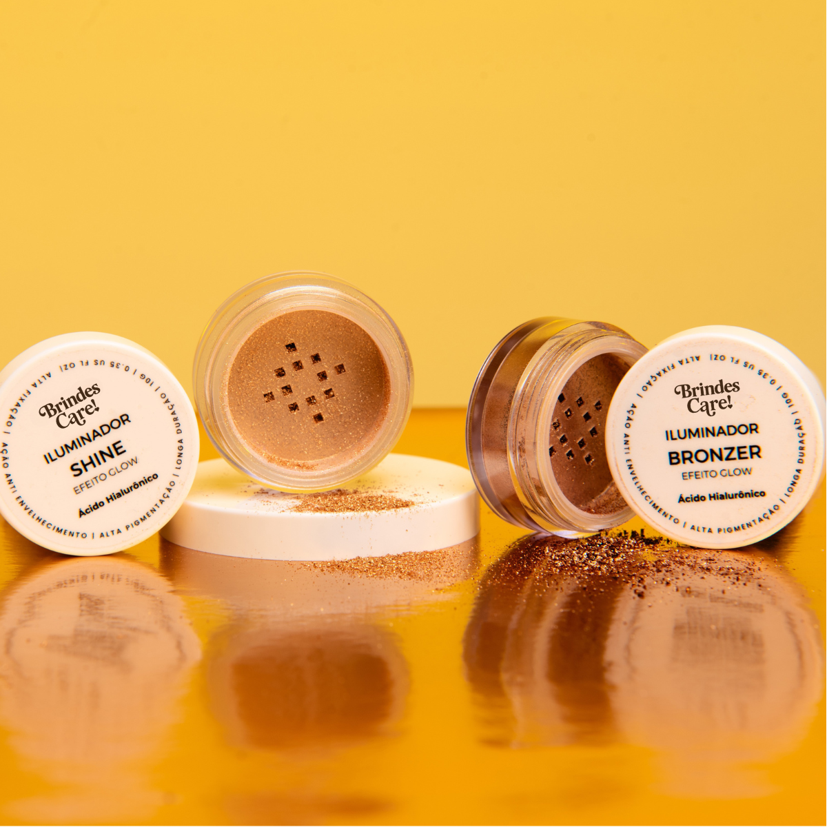 O nosso Iluminador Shine e Bronzer Glow tem pigmentação de alta performance e aquele efeito radiante que sua cliente AMA! Em 4 cores vibrantes atende todos os tipos de pele! Ilumina e dura o dia todo, o acabamento elegante que sua make merece! Acabamento sofisticado